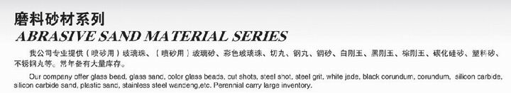 我集團公司提供數據(噴砂(sha)(sha)用(yong))波璃珠(zhu)、(噴砂(sha)(sha)用(yong))波璃砂(sha)(sha)、彩色的(de)波璃珠(zhu)、切丸(wan)、鋼(gang)(gang)丸(wan)、鋼(gang)(gang)砂(sha)(sha)、白剛(gang)玉(yu)、黑剛(gang)玉(yu)、棕(zong)剛(gang)玉(yu)、無(wu)定形碳(tan)硅砂(sha)(sha)、橡膠砂(sha)(sha)、304不(bu)銹鋼(gang)(gang)丸(wan)等。常(chang)期配備大規模存(cun)貨(huo)。
