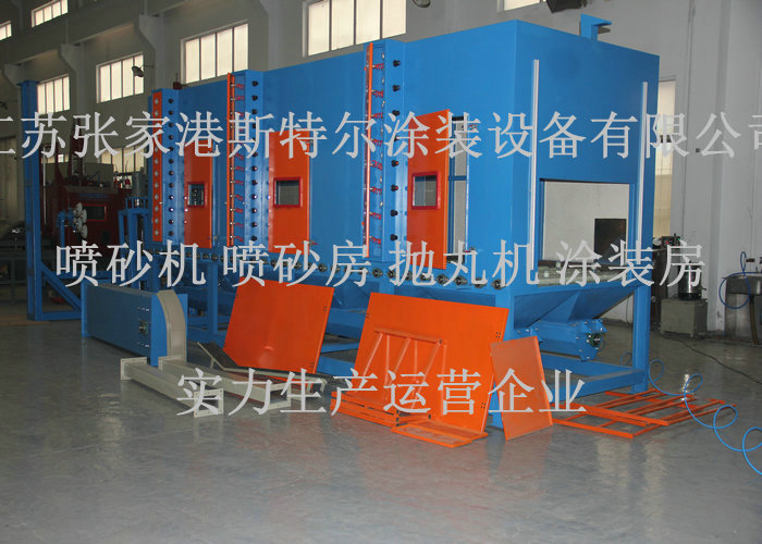 方形坩堝產品內壁處理要求而專門設計的專用型輸送式自動噴砂機,適合需求公司所提供的產品。根據需求公司對產品效率的要求,本機設置一套自動輸送線,共分五段線體。噴砂艙內共設三個噴砂位,工件通過輸送線體帶動步進方式分別在三個噴砂位進行噴砂加工清理,噴砂區域內共布置20支普壓高速噴砂咀,在噴砂區第一個噴砂位布置8支噴咀噴工件內底面,在噴砂區第二個噴砂位布置6支噴咀噴工件內前后側面,在噴砂區第三個噴砂位布置6支噴咀噴工件內左右側面,噴咀可根據加工需要,適當調整其噴射角度,其自動化程度較高。每個工件需間歇進行三次噴砂清理加工,才能完成整個內表面的清理。在出口處設有翻轉機構,用于傾倒內部的砂料,該動作自動完成,無需人工操作。 噴砂施工工藝工作流程