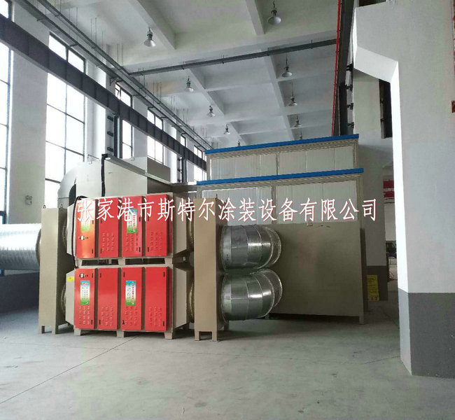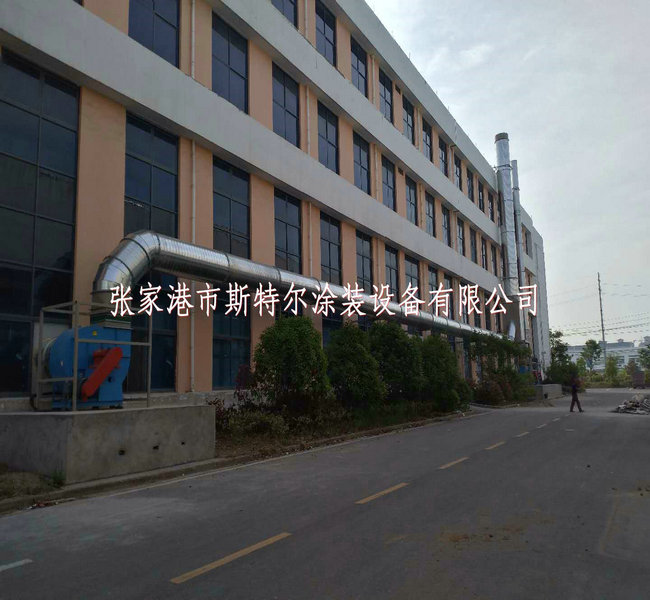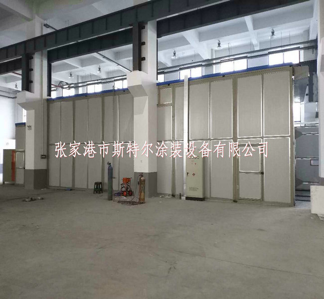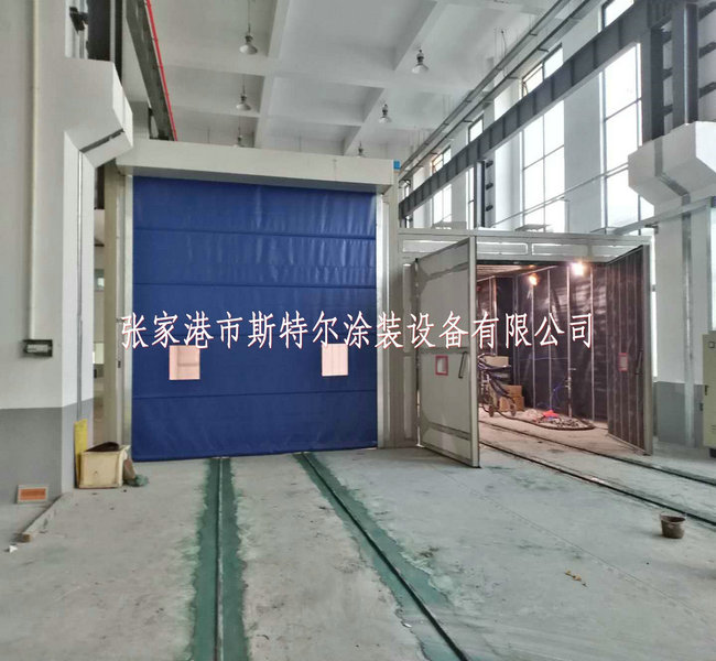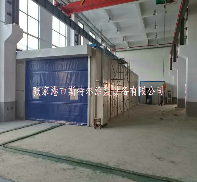 噴鋅房(fang)大小16X5.8X3.5m,的墻選用10#方管(guan)當作(zuo)骨架,鑲入75mm巖棉(mian)夾心板。門為直(zhi)流(liu)電動增強式,尾部設有濕潤顆粒物物活(huo)性炭過濾墻。