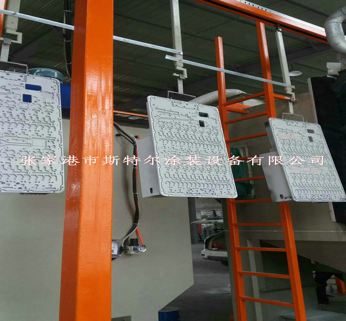 江蘇某企業在我司定制的懸掛鏈自動噴砂機具有以下幾個特點貨(huo)品:主要是華為75G 基(ji)站設備鋁殼板。