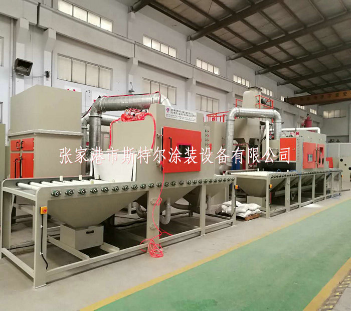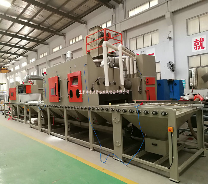 工人只操作噴砂機的控制系統和裝卸工件(或由上下工序的噴砂機的輸送機構輸入或者輸出),需要噴砂的工件放置在噴砂機的輸送機構上會自動運行經過吹氣倉后在通過噴砂工作倉進行表面噴砂處理,表面達到一定的粗糙度及達到除油,除污垢的最終效果,噴砂機加工結束后在經過除塵倉及吹氣倉,最終經過噴砂機的輸送機構運送出來。即噴砂加工結束。經過人工識別檢測后搬離,如工件上面有殘留的砂粒及粉塵時由人工使用吹氣槍清理結束后搬離。一般在噴砂機的一端出口會設計吹氣風刀,達到粉塵及砂料95%以上清除干凈。但是有可能殘留在死角及內孔里的砂料,在這種情況下只有靠人工清理,才可以全部清理結束。 生產制造按序如下所示: